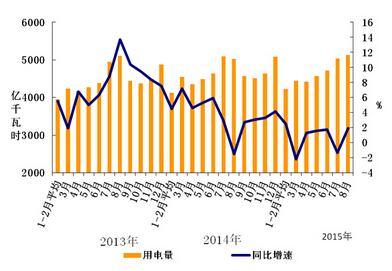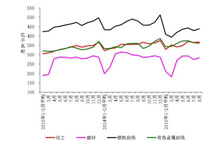1-8月份,化学原料制品、非金属矿物制品、黑色金属冶炼、有色金属冶炼四大高载能行业用电量合计11073亿千瓦时,同比下降 2.1%,增速同比回落6.6个百分点;合计用电量占全社会用电量的比重为30.1%,对全社会用电量增长的贡献率为-68.0%。其中,化工行业用电量2807亿千瓦时,同比增长2.5%,增速同比回落2.4个百分点;建材行业用电量2022亿千瓦时,同比下降6.4%,增速同比回落14.2个百分点;黑色金属冶炼行业用电量3370亿千瓦时,同比下降7.9%;增速同比回落9.9个百分点;有色金属冶炼行业2875亿千瓦时,同比增长4.2%,增速同比回落0.7个百分点。