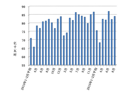 分产业看,1-8月份,第一产业用电量704亿千瓦时,同比增长2.3%,占全社会用电量的比重为1.9%;第二产业用电量26431亿千瓦时,同比下降0.7%,占全社会用电量的比重为71.9%,对全社会用电量增长的贡献率为-54.3%;第三产业用电量4756亿千瓦时,同比增长7.5%,增速同比提高1.7个百分点,用电量占全社会用电量的比重为12.9%,对全社会用电量增长的贡献率为93.6%;城乡居民生活用电量4890亿千瓦时,同比增长4.3%,增速同比提高0.5个百分点,占全社会用电量的比重为13.3%,对全社会用电量增长的贡献率为56.2%。