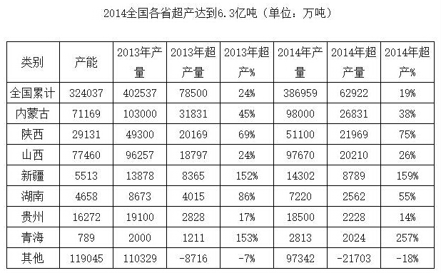 2014年煤炭产量38.7亿吨,而“两证”齐全的煤矿共计约6636处,产能合计32.4亿吨(拟投产煤矿约3.5亿吨,产能共计约35.9亿吨)。各省总计共超产6.3亿吨,超产幅度达到19.4%,而即使考虑拟投产煤矿,超产幅度也达到4.5亿吨/13.3%(新增产能当年按一半产量计算)。