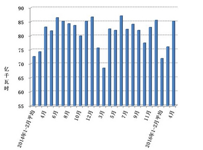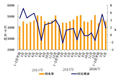 4月份,四大高载能行业用电量合计1454亿千瓦时,同比下降0.5%,增速比上年同期提高2.5个百分点,占全社会用电量的比重为31.8%。其中,化工行业用电量362亿千瓦时,同比增长5.9%,增速比上年同期提高4.5个百分点;建材行业用电量283亿千瓦时,同比增长4.4%,增速比上年同期提高15.5个百分点;黑色金属行业用电量402亿千瓦时,同比下降4.3%,增速比上年同期提高2.8个百分点;有色金属冶炼行业407亿千瓦时,同比下降4.9%,增速比上年同期回落10.0个百分点。
