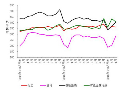 1-4月份,化学原料制品、非金属矿物制品、黑色金属冶炼、有色金属冶炼四大高载能行业用电量合计5267亿千瓦时,同比下降