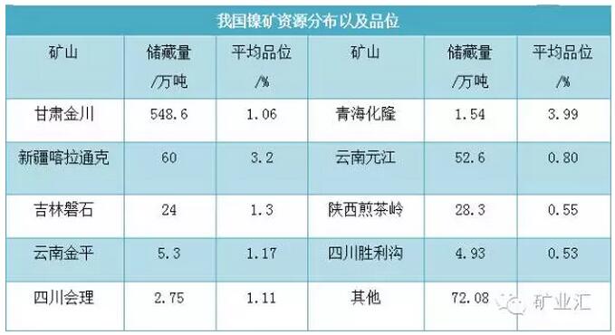 我国镍矿资源较为丰富,其中硫化铜镍矿约占全国总量的90%,共伴生矿产多,而红土镍矿藏量仅占总量的10%左右。其中矿藏最多的是甘肃金川、新疆喀拉通克和吉林磐石。