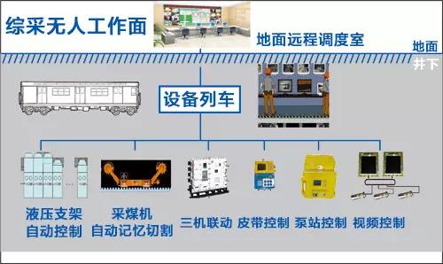 地面或顺槽集中监控采煤机、支架、三机、泵站、移变和开关等。